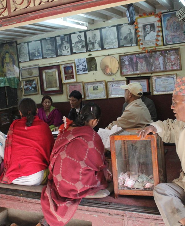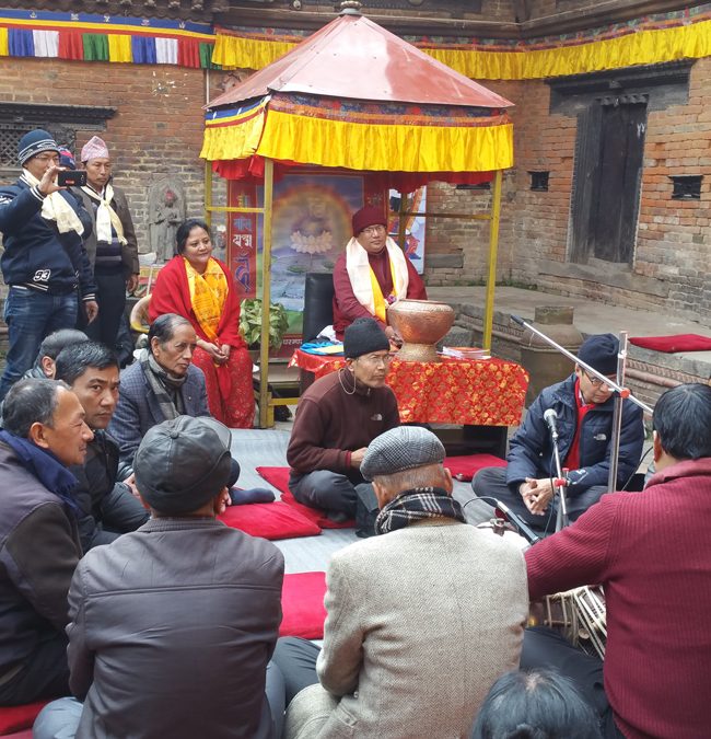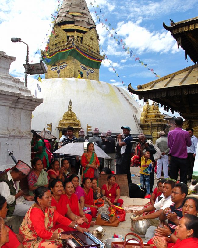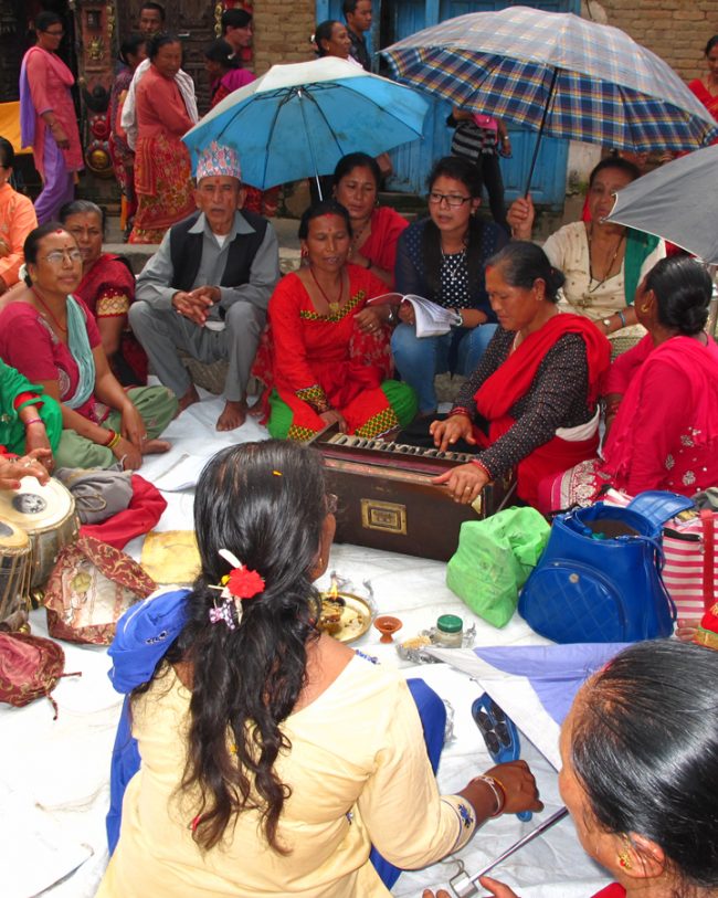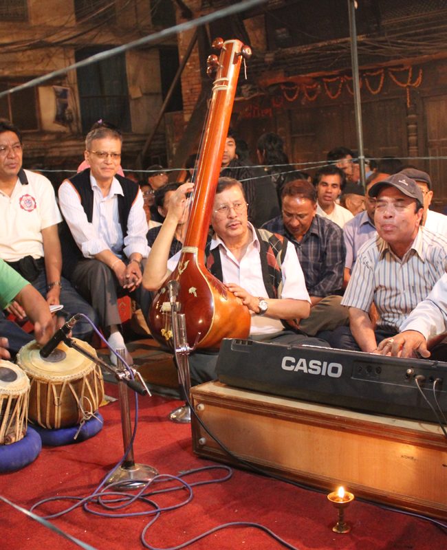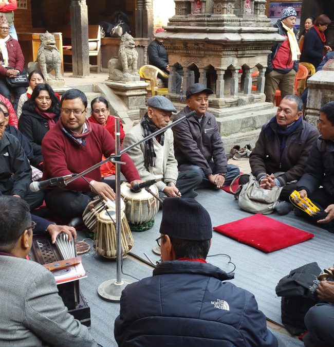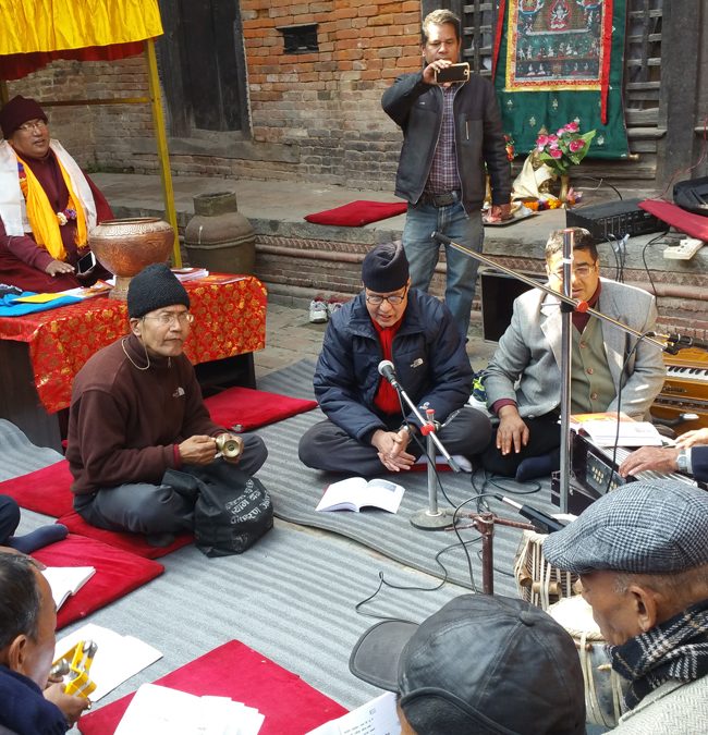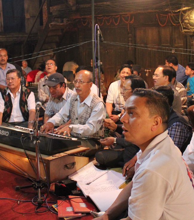 This is the most recently created musical genre that Newar Buddhists adopted from the modern tradition of South Asian devotionalism. The central sound of this seated ensemble is centered on the harmonium and the tabla, with a cymbal player involved keeping time for the chorus of singers. In the past seventy years, dozens of Newar Buddhist literati have composed songs with lyrics conveying Dharma teachings, and expressing devotion to Buddhas and bodhisattvas, often sung with bhakti-style fervor.