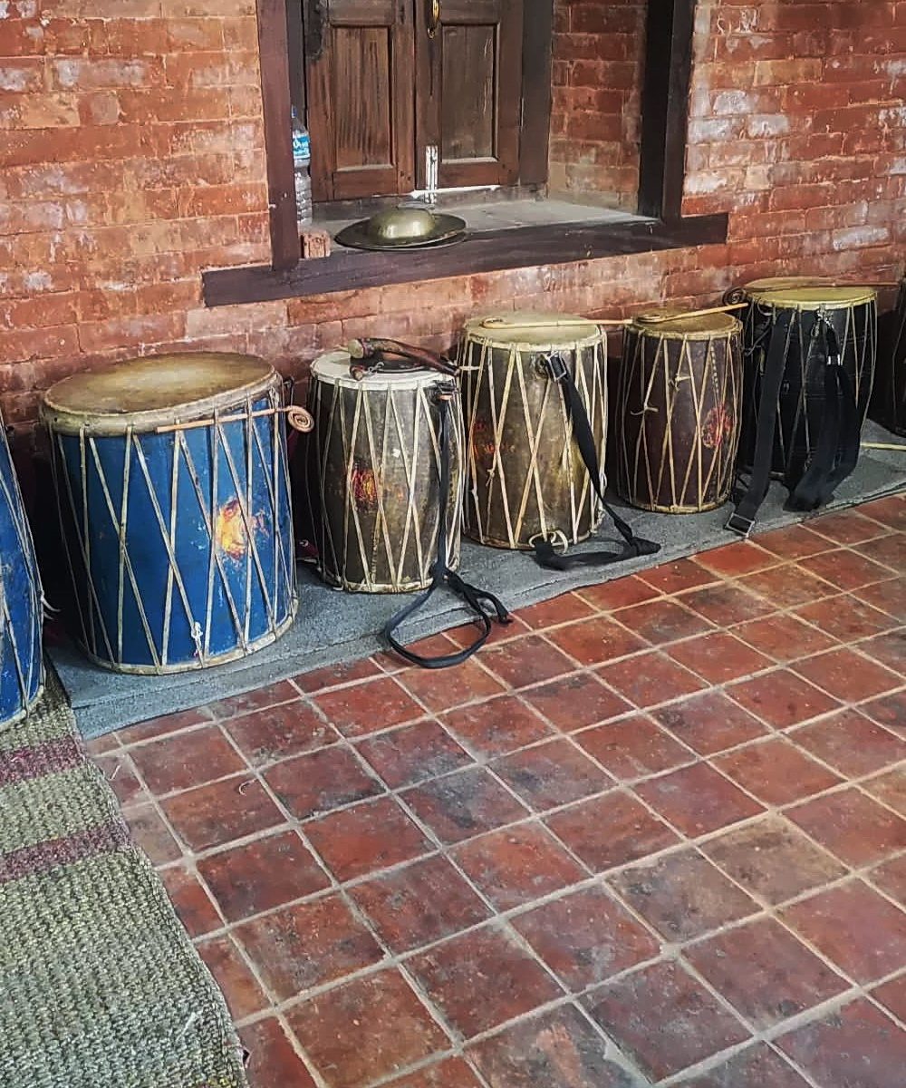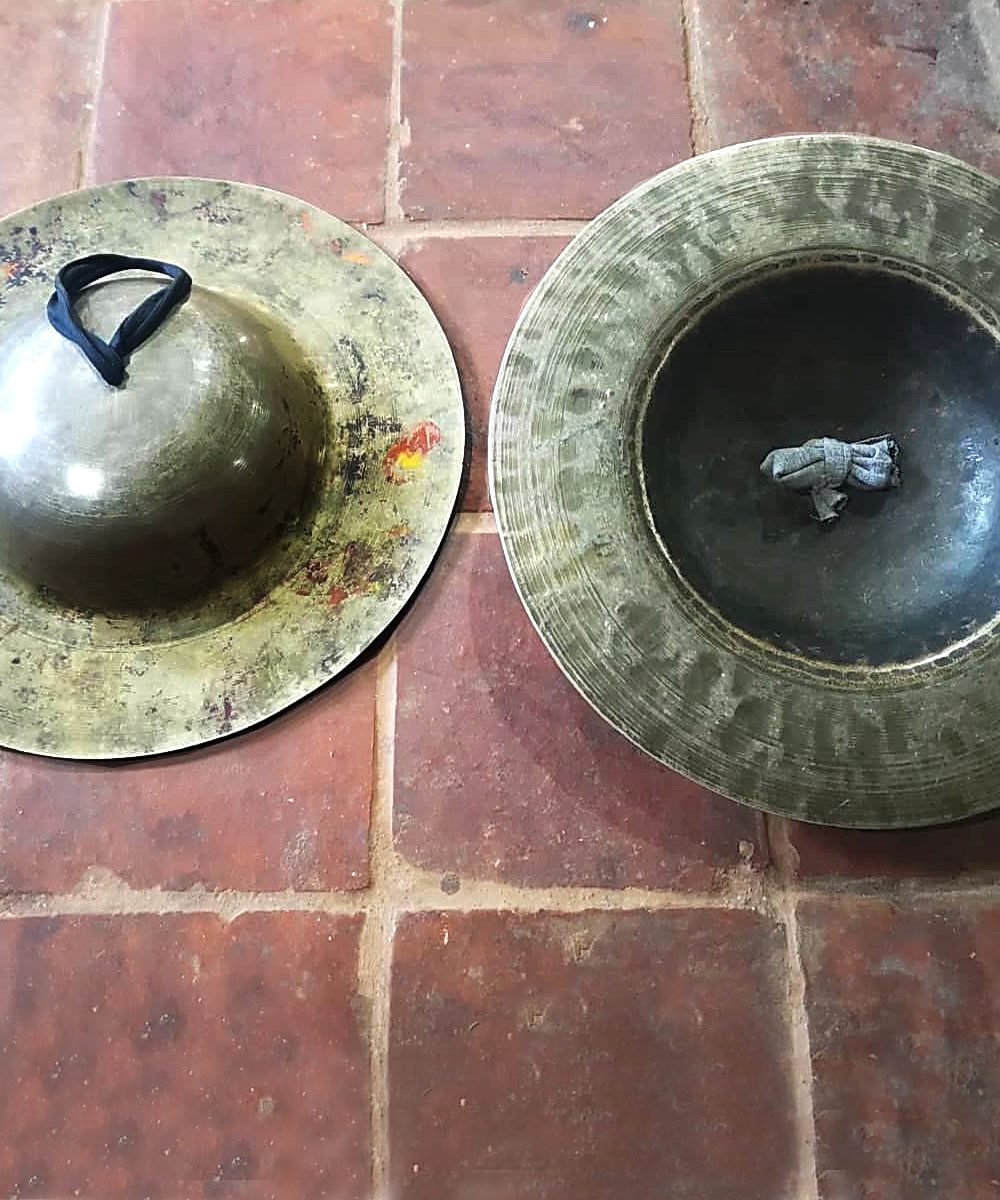 The ensemble is called “Mu Dhimay Bājan” when on major festival occasions there is the addition of a difficult individual performance linked to the pulsing music: a strong man “circle-whirling” a very long slightly cured bamboo pole affixed with one or more yak tail tassels and colorful flags. Keeping his balance and the pole upright, he twirls the pole around in front of his body and, more difficult yet, passes it around and behind him, changing hands in the process, never losing control.