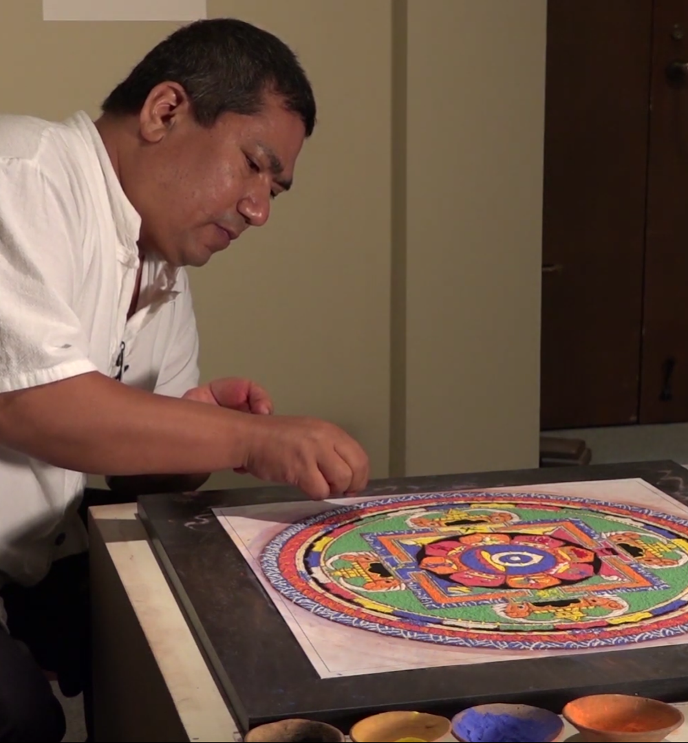 The gallery’s stone powder maṇḍala was created over a week beginning on September 4 by the Newar vajrācārya master Naresh Man Bajracharya, who is currently a Fulbright scholar-in- residence and lecturer at Holy Cross. This Adhivāśana maṇḍala was made as an adjunct to the pratiṣṭha (“image consecration”) ceremony done on campus on Saturday, September 14 th.
