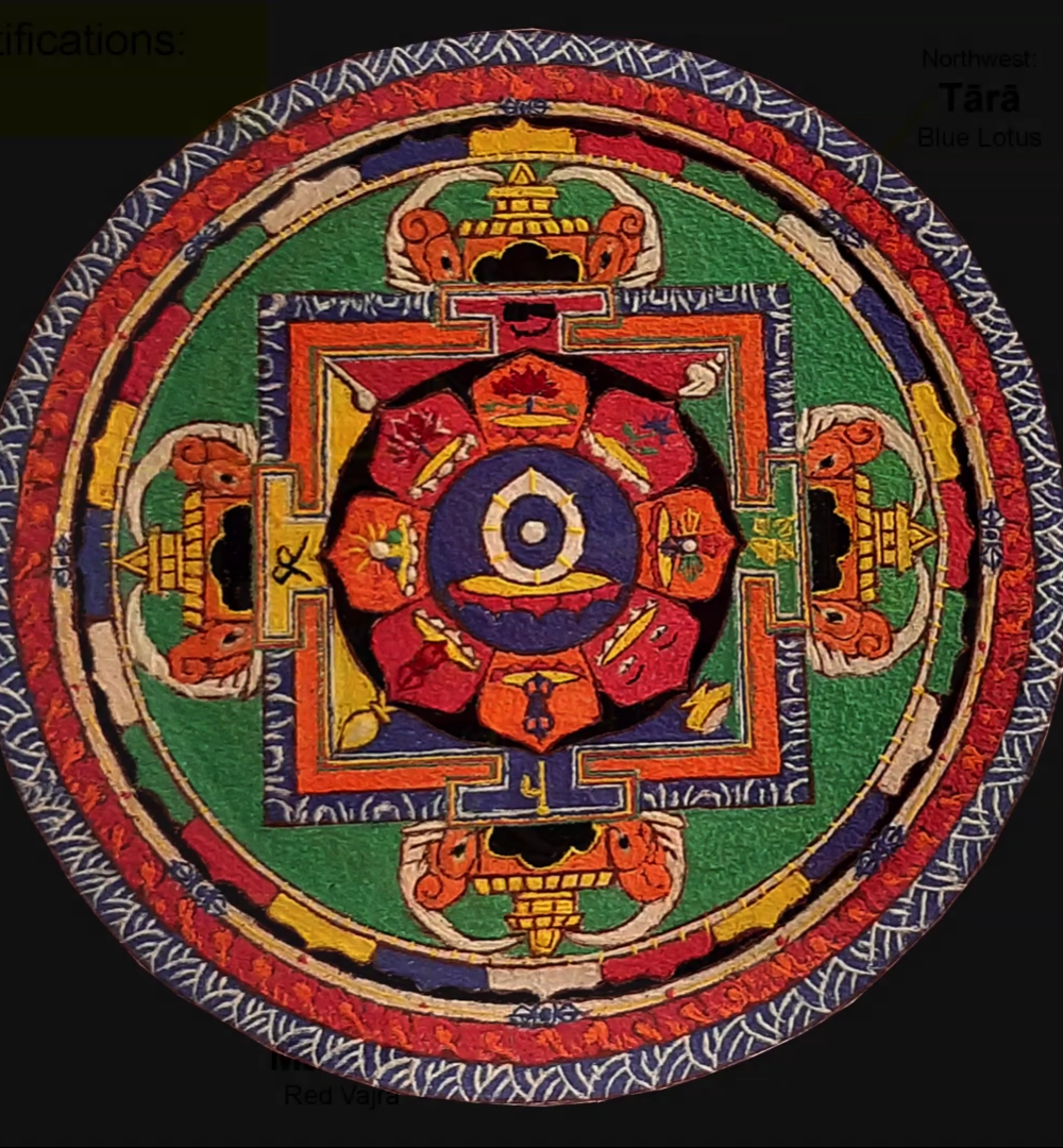 For over 1500 years, Buddhists have devised diagrams to illustrate their teachings, a tradition that developed further to employ them for a variety of rituals and as paradigms for advanced visualization meditations. In the Vajrayāna traditions that grew out of the Mahāyāna lineage of following the Buddha’s teachings, the siddha saints who led this movement discovered and taught practices that defined paths to rapid enlightenment. Each of these were called “sādhana.” Hundreds survive, the subject of many texts and paintings; each sādhana seeks to transform the body, speech, and mind of the disciple, using mūdras (hand gestures), mantras, and maṇḍalas as tools for religious practices. The maṇḍala’s overall design, along with exact symbols and colors, were specified to shape specific spiritual impacts on the practitioner.